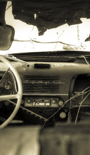 "a Smartphone Resting On A Car Dashboard Against A Cracked Windshield" Wallpaper -