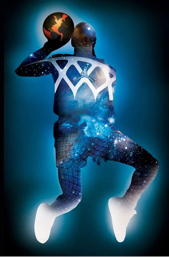 A Basketball Player Is Jumping In Space With A Ball Wallpaper -