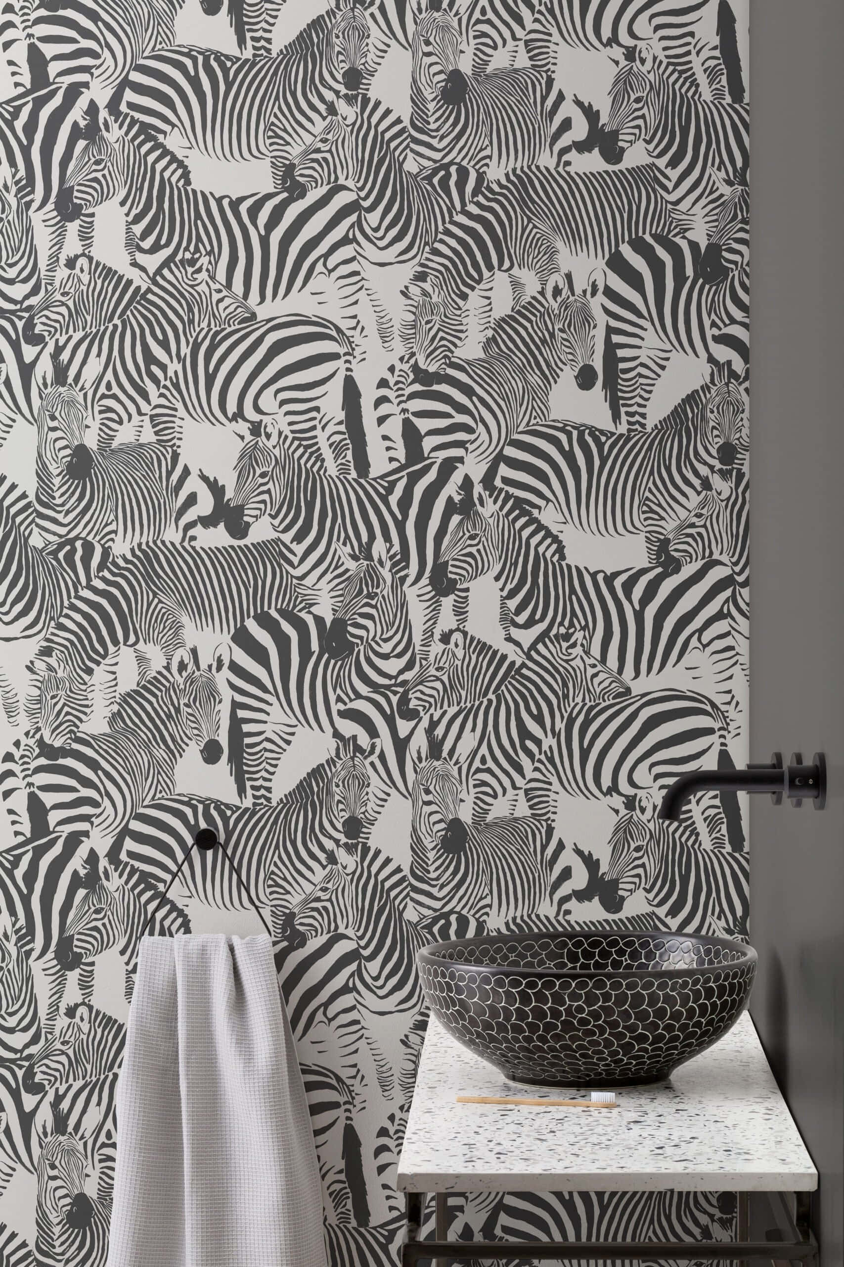 A Bathroom With Zebra Wallpaper And A Sink Wallpaper -