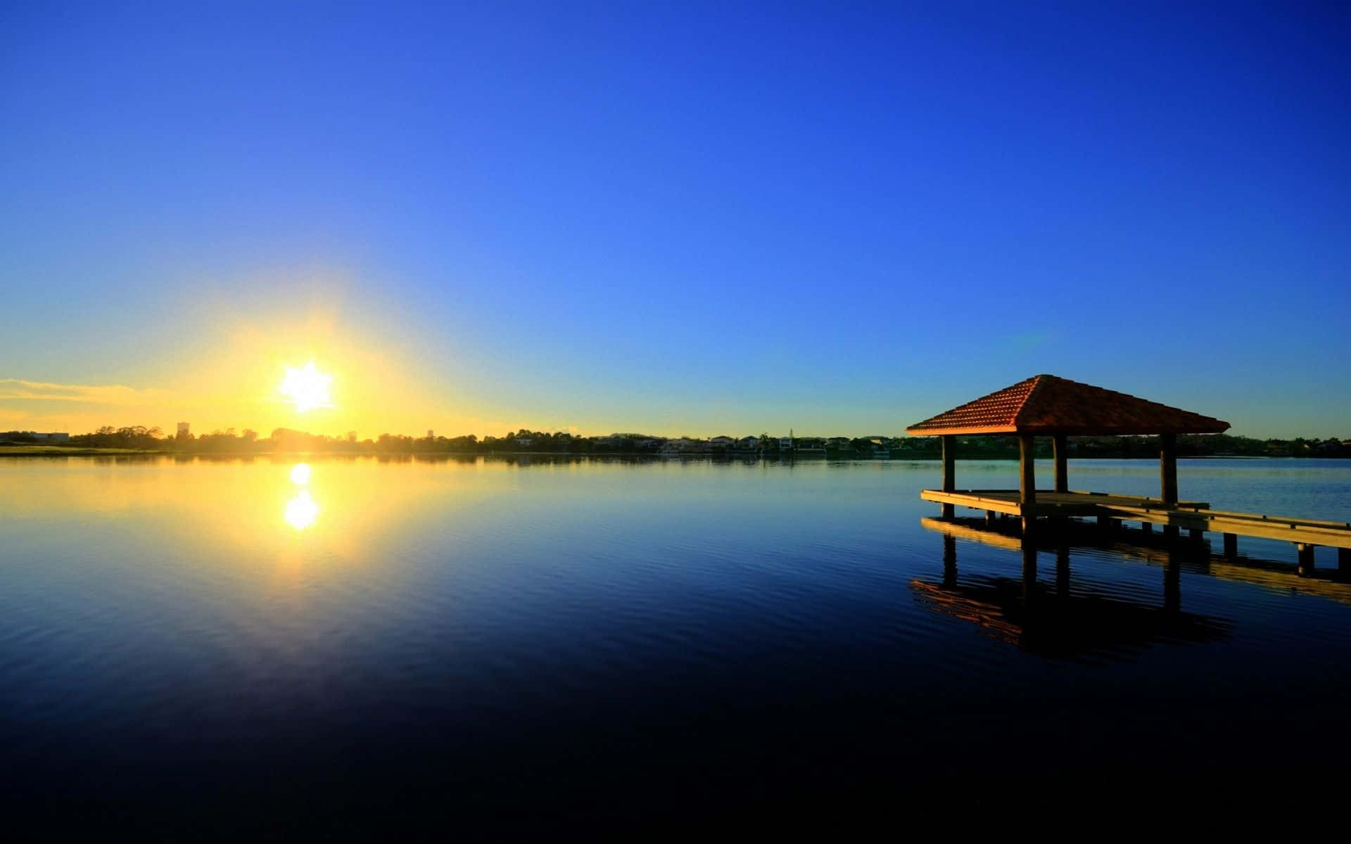 Sunrise Illuminating A Tranquil Lake Surrounded By Trees Wallpaper -