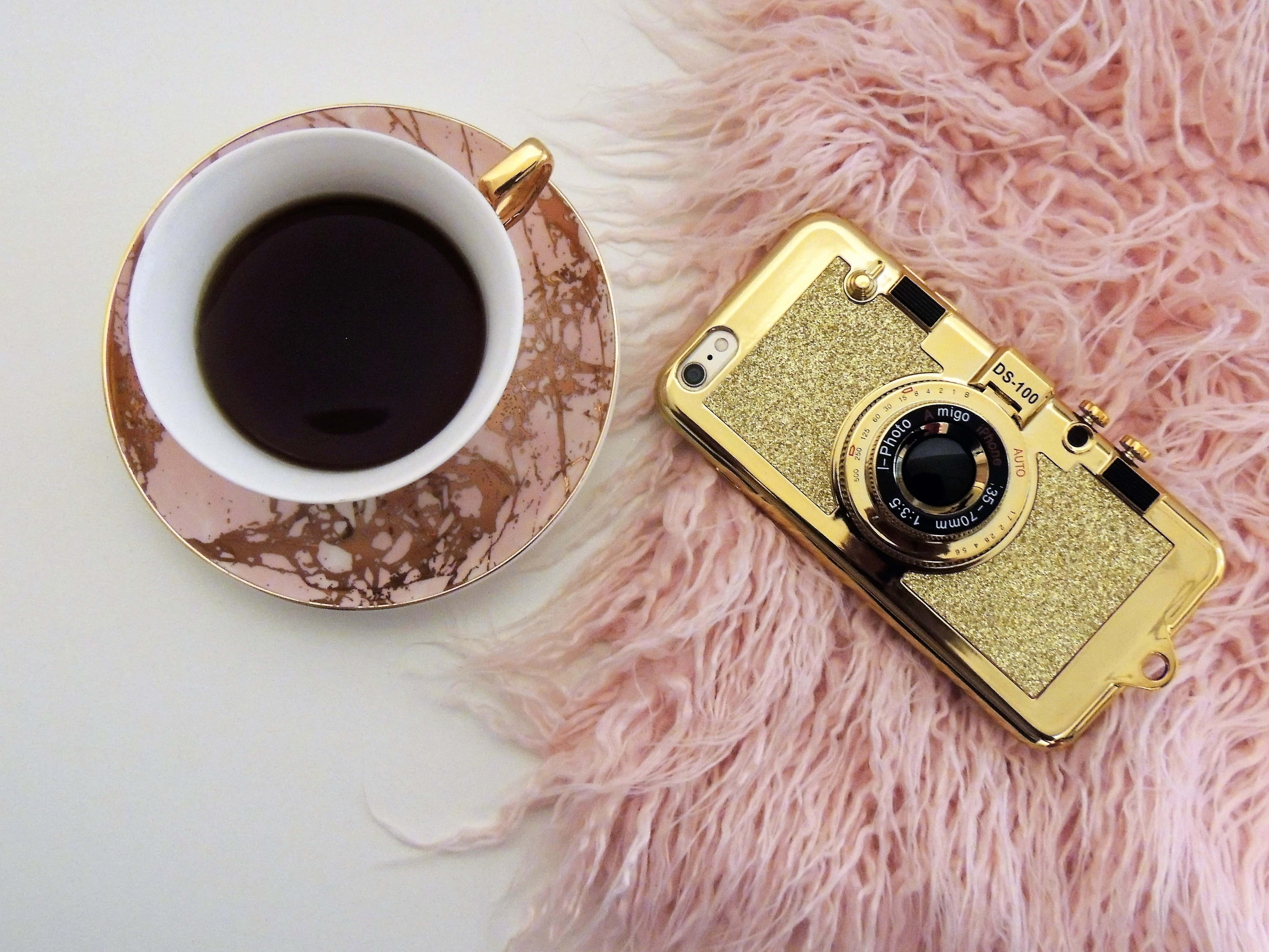 Related A Cup Of Coffee And A Gold Camera On A Pink Fur Wallpapers