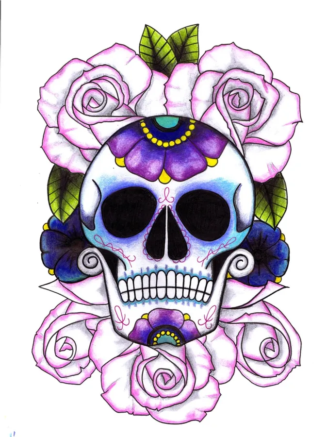 A Drawing Of A Skull With Roses And Purple Flowers -