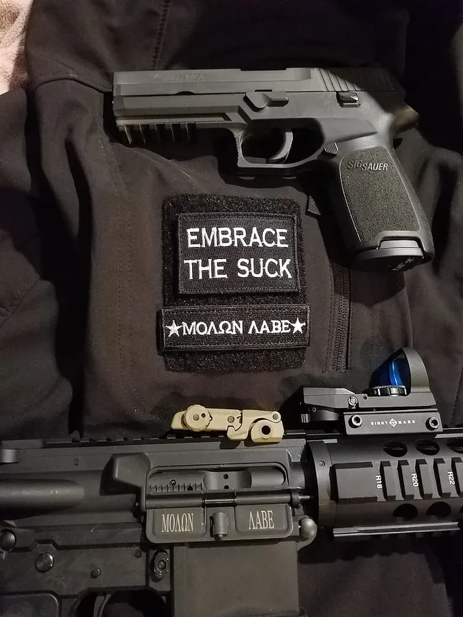 A Gun And A Patch With The Words Embrace The Suck Wallpaper