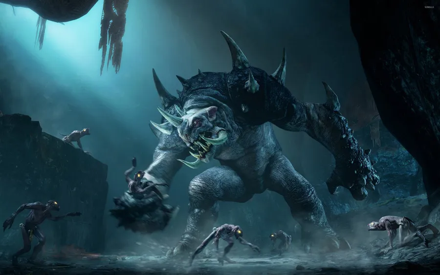 A Large Monster Is Standing In A Cave Wallpaper
