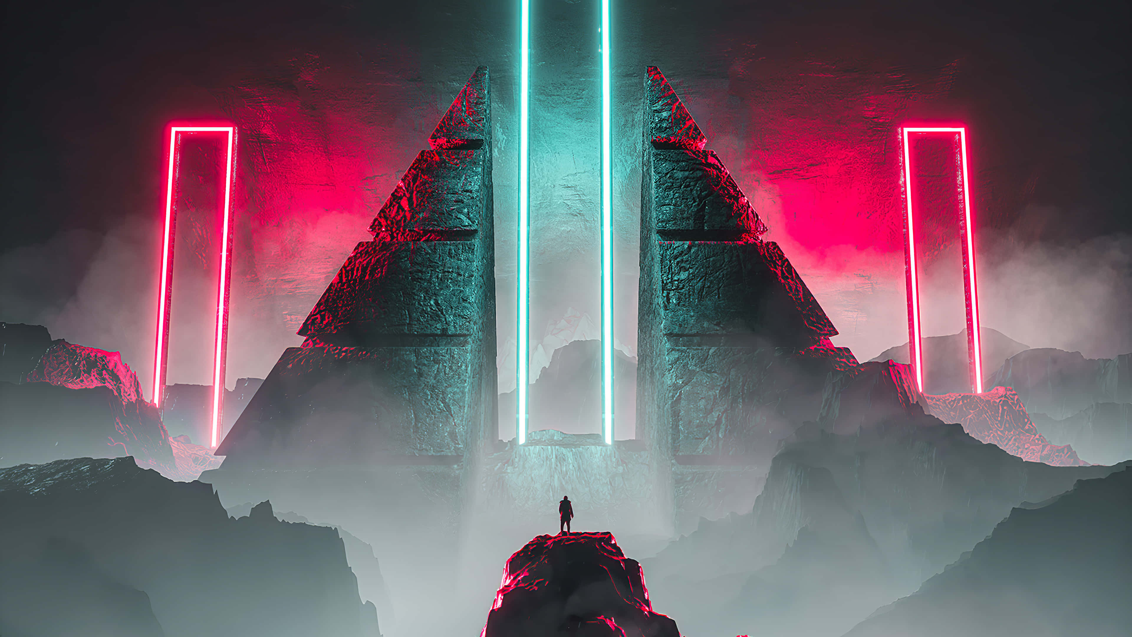 A Man Standing On Top Of A Mountain With Neon Lights Wallpaper