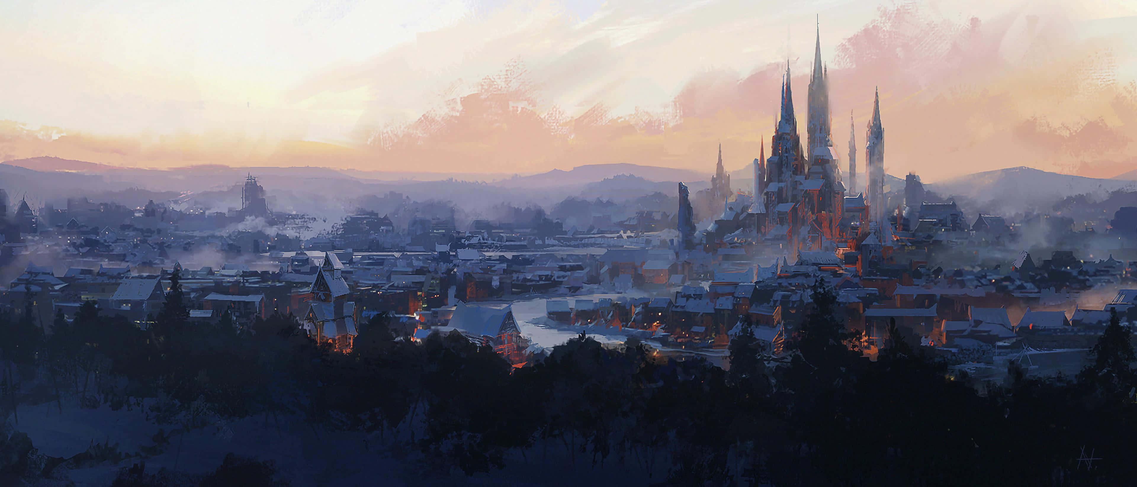 A Painting Of A City At Sunset Wallpaper