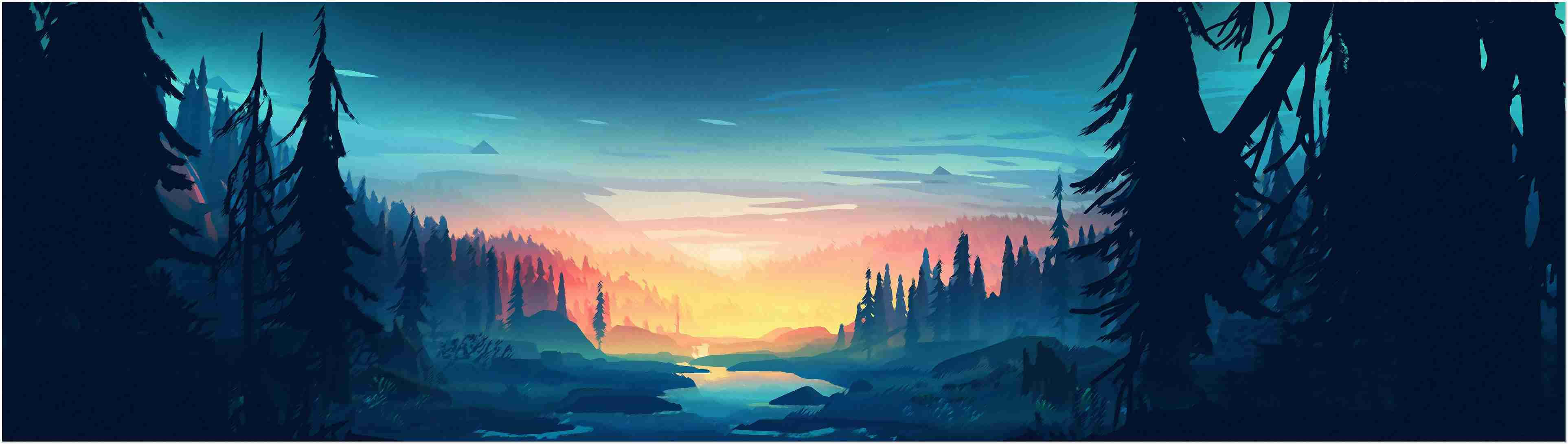 Related A Painting Of A Forest With A River In The Background Wallpapers
