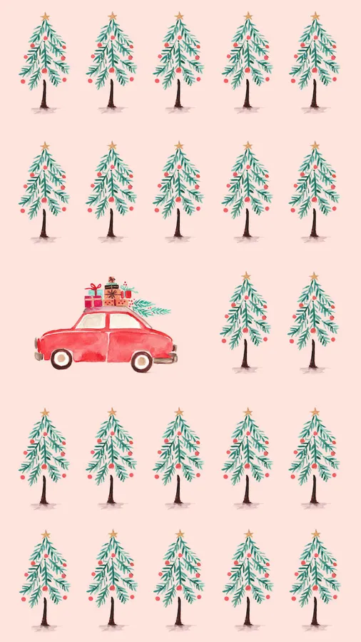 A Pink Background With A Red Car And Christmas Trees Wallpaper -