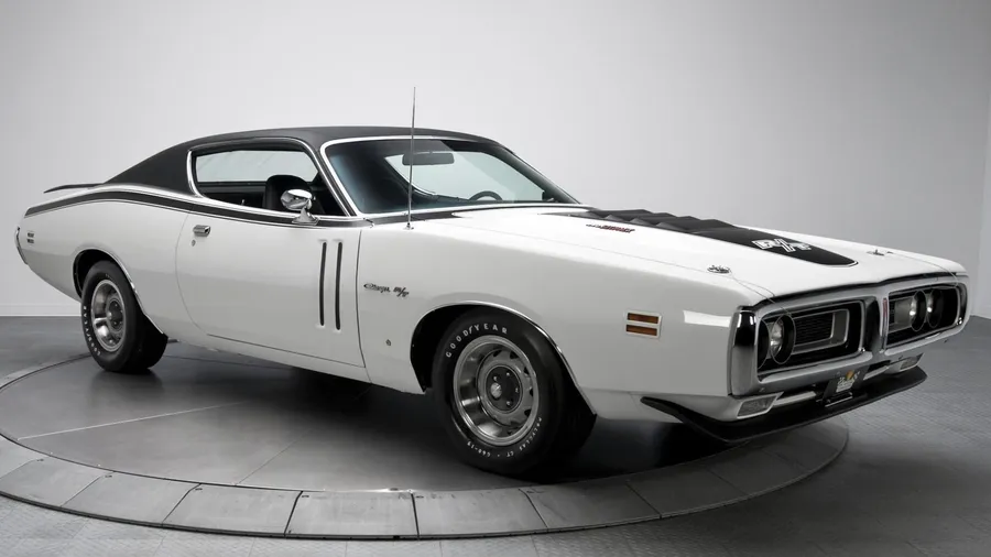 A White Dodge Charger Is On Display In A Room Wallpaper