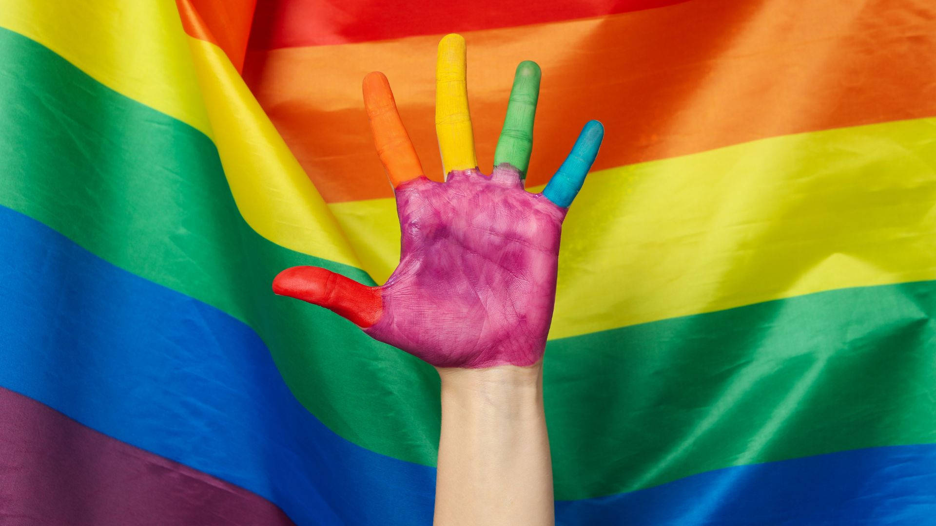 A Woman's Hand Painted With Rainbow Colors Is Raised Up Against A Rainbow Flag Wallpaper