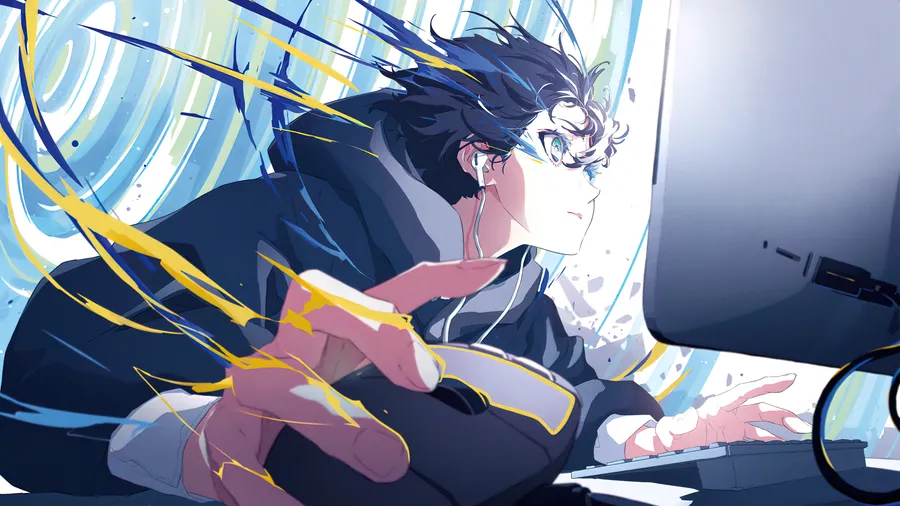 Young Anime Boy Gaming At His Computer Wallpaper -
