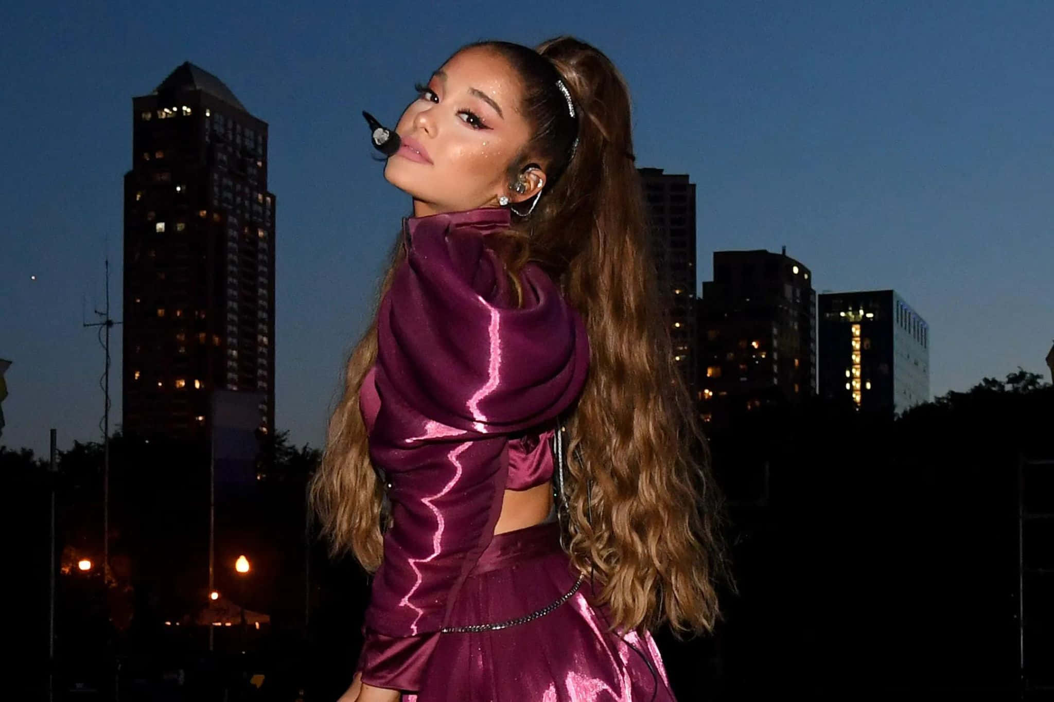 Ariana Grande Purple Outfit Performance Wallpaper