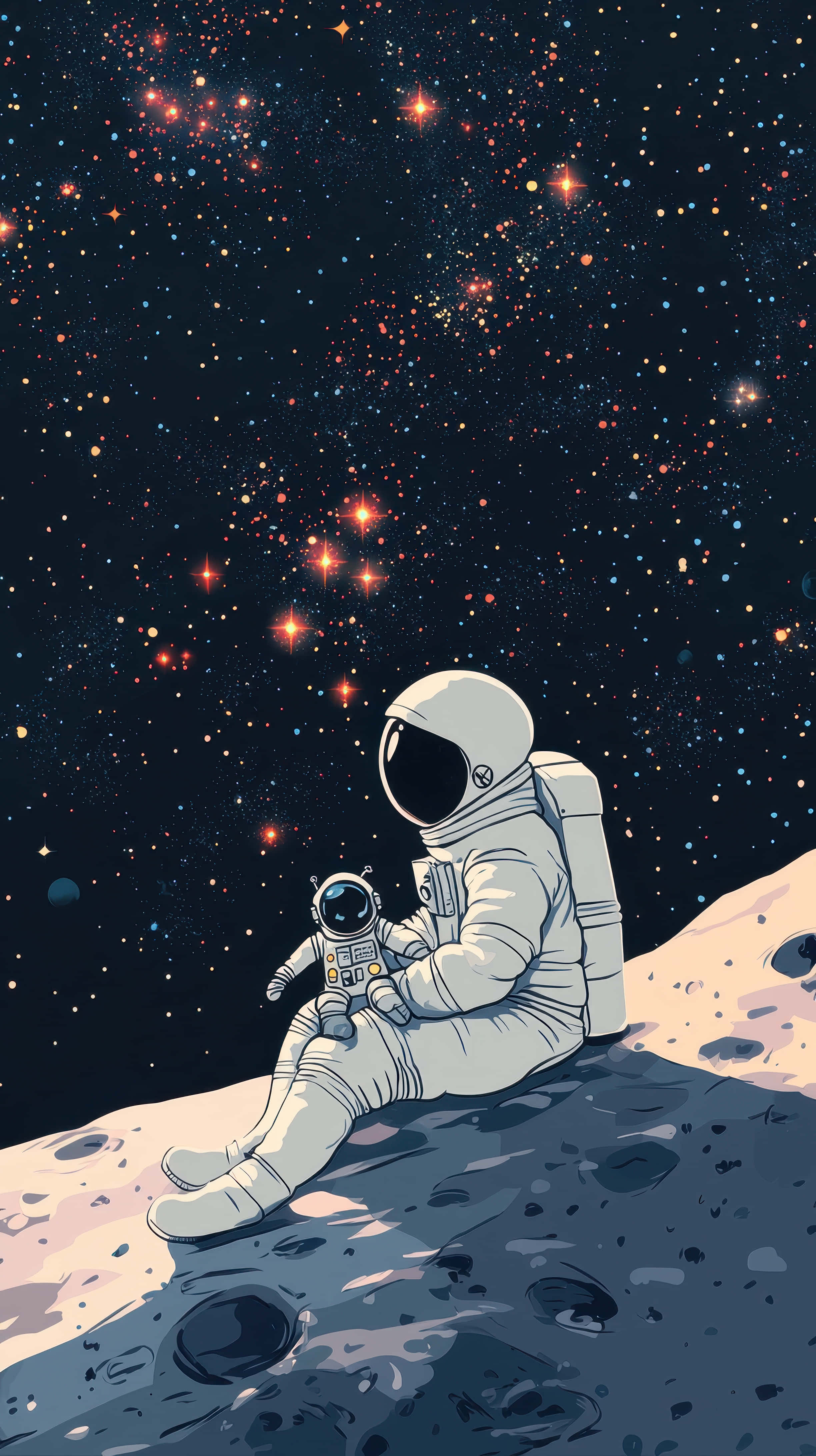 Astronaut Relaxing On A Rocky Cosmic Moon Surface Gazing Into Sky Wallpaper