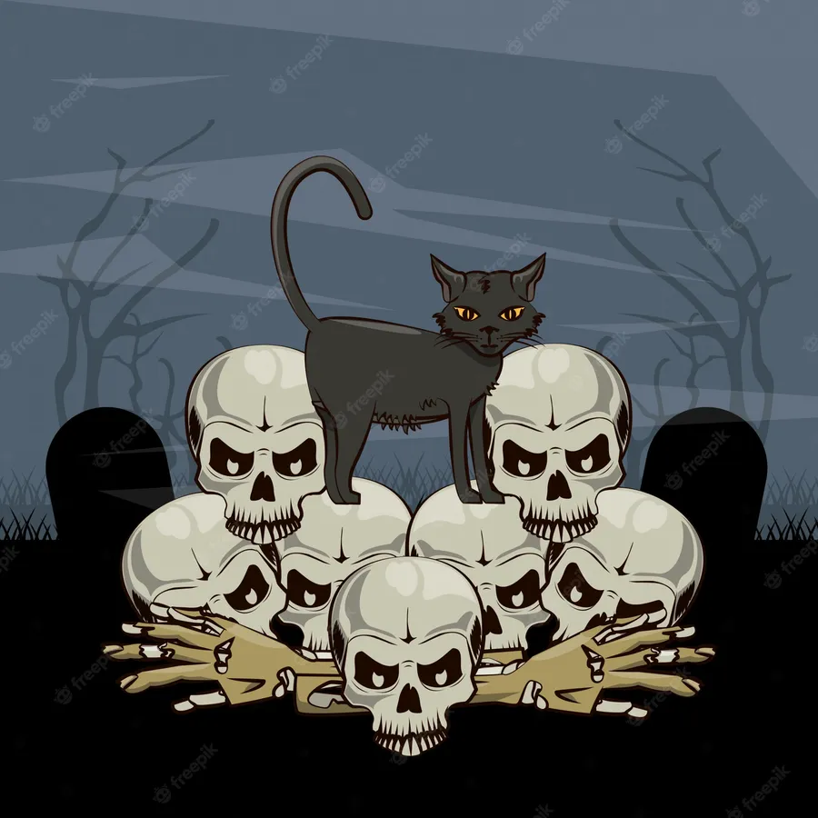 Cartoon Scary Cat On Skulls -
