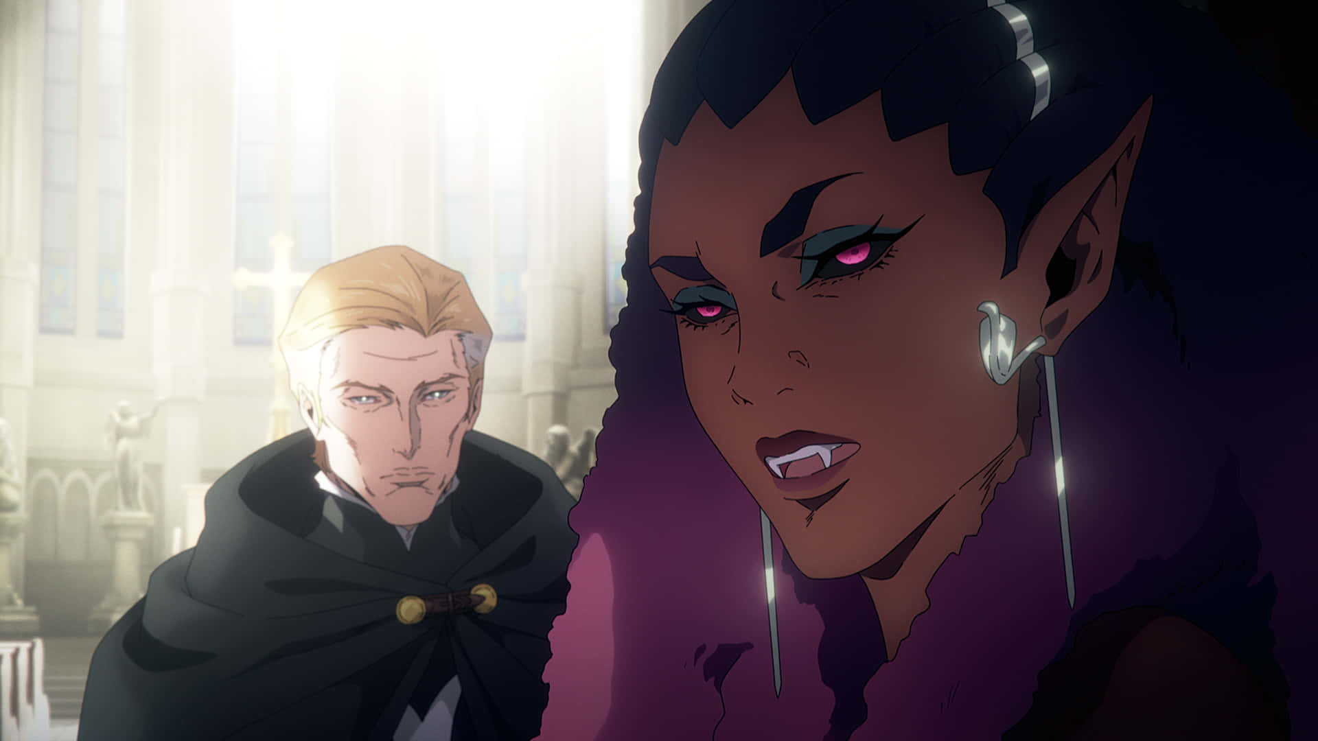 Castlevania Netflix Carmillaand Hector Discussion Wallpaper -