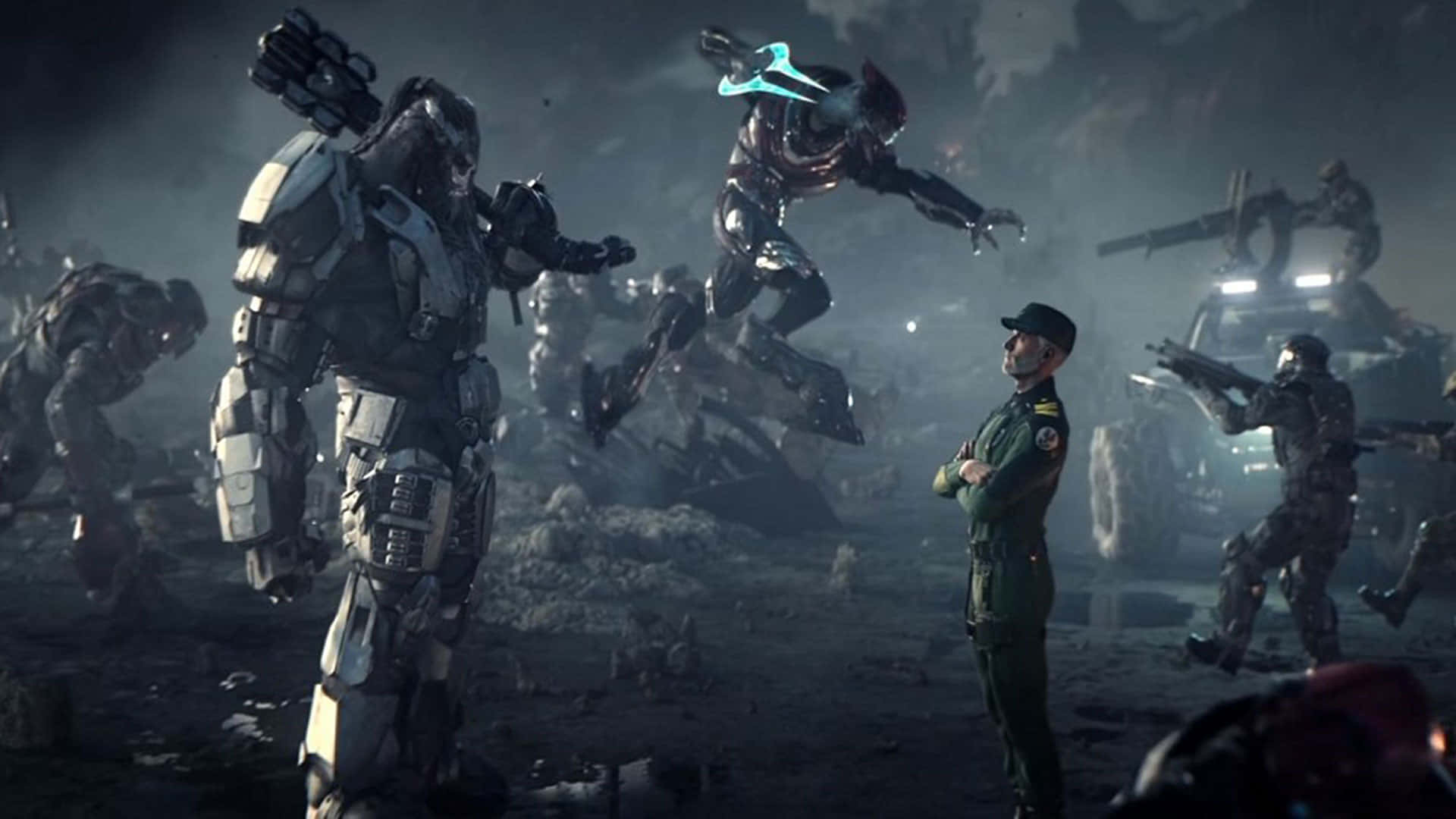 Cool Halo Soldiers And Human Officer Wallpaper