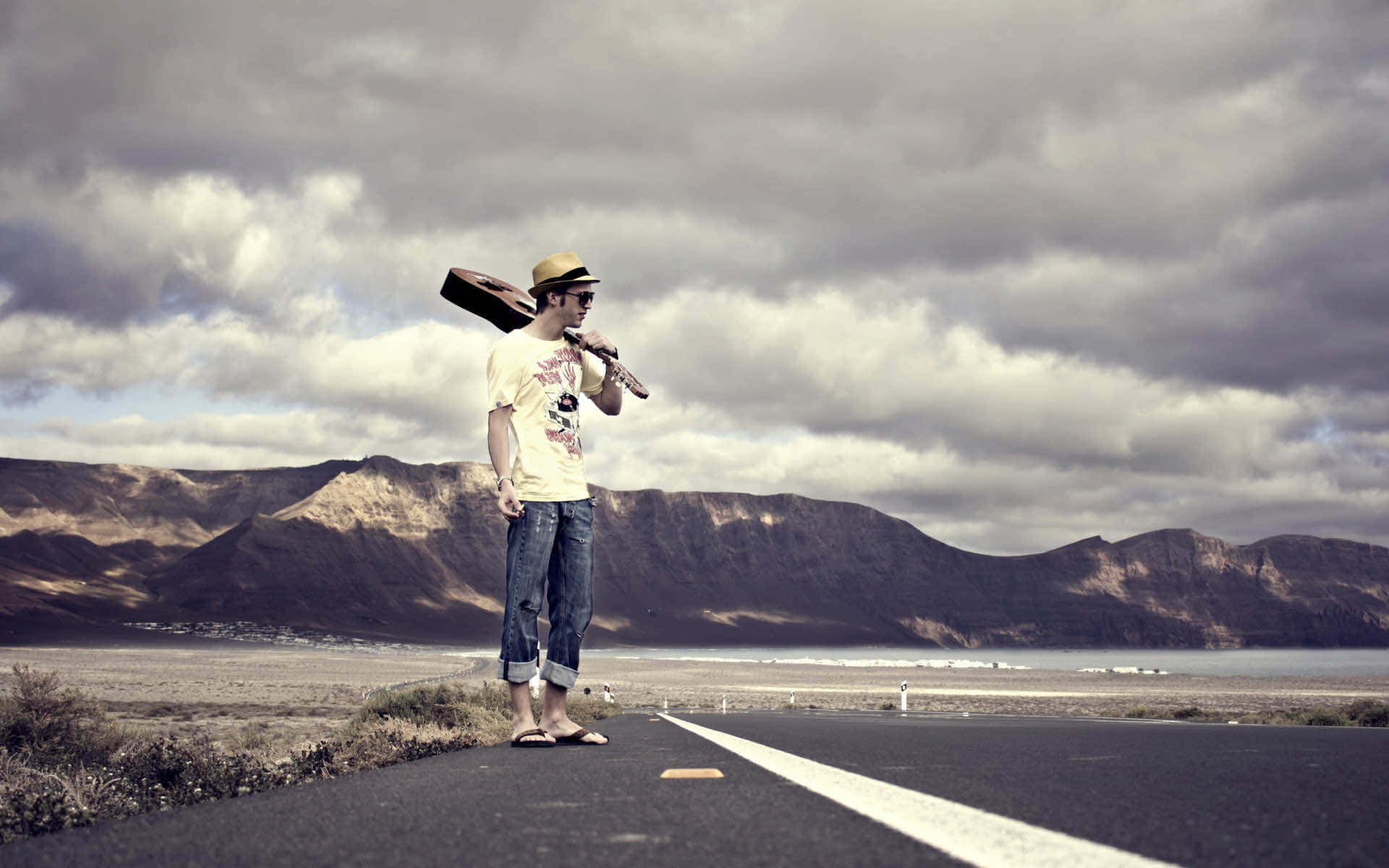 Cool Sad Boy Carrying A Guitar Wallpaper -