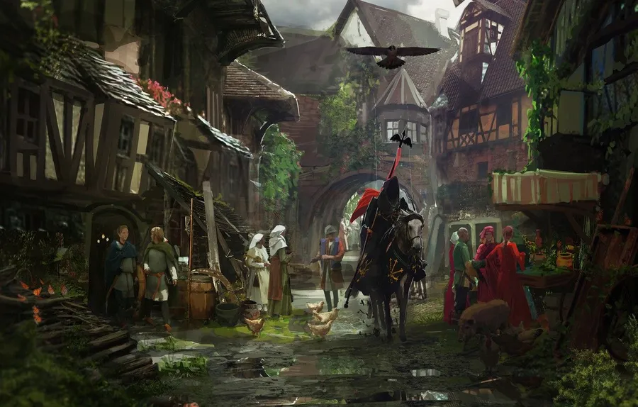 A Painting Of A Medieval Town With People And Horses Wallpaper -