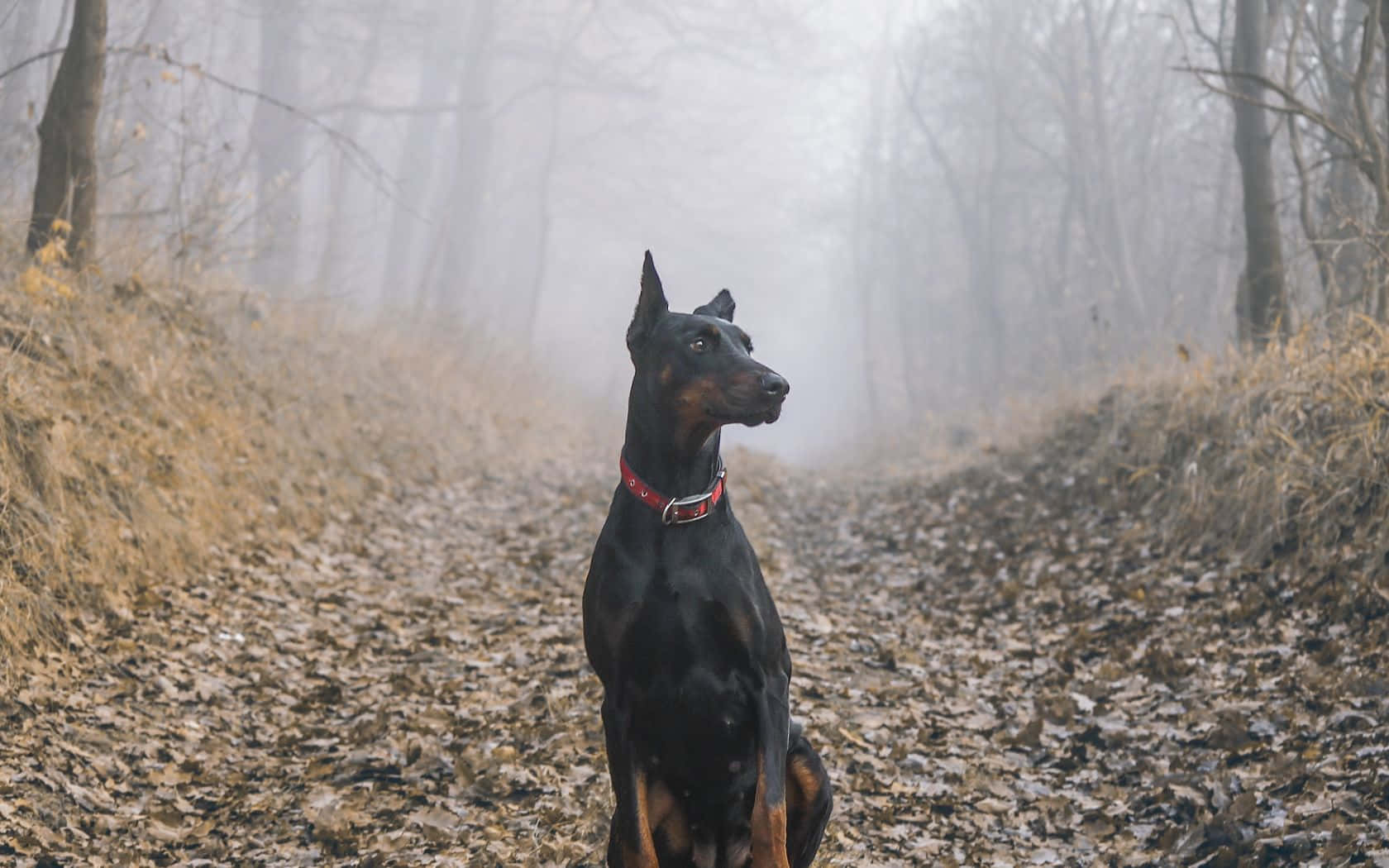 Doberman Pinscher On Dark Forest Wallpaper -