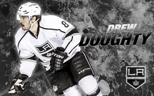 Drew Doughty With Name And Los Angeles Kings Logo In Faded Effect Wallpaper -