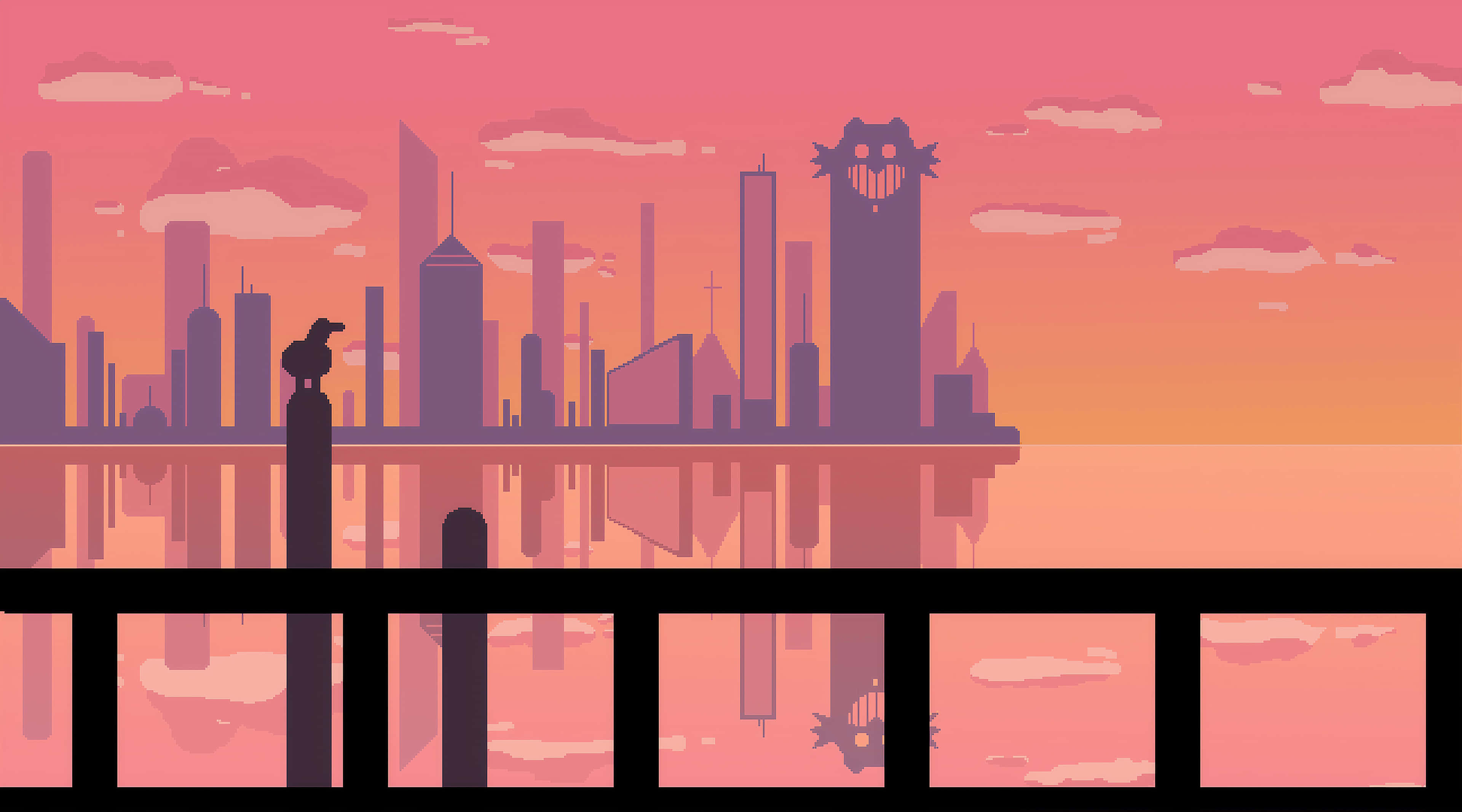 Reflective Waters City Pixel Art Wallpaper -