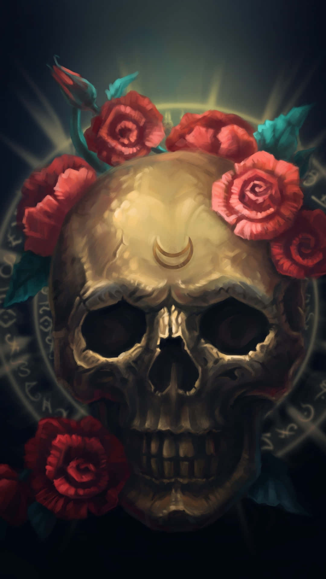 A Skull With A Green And Gold Design On A Black Background Wallpaper -