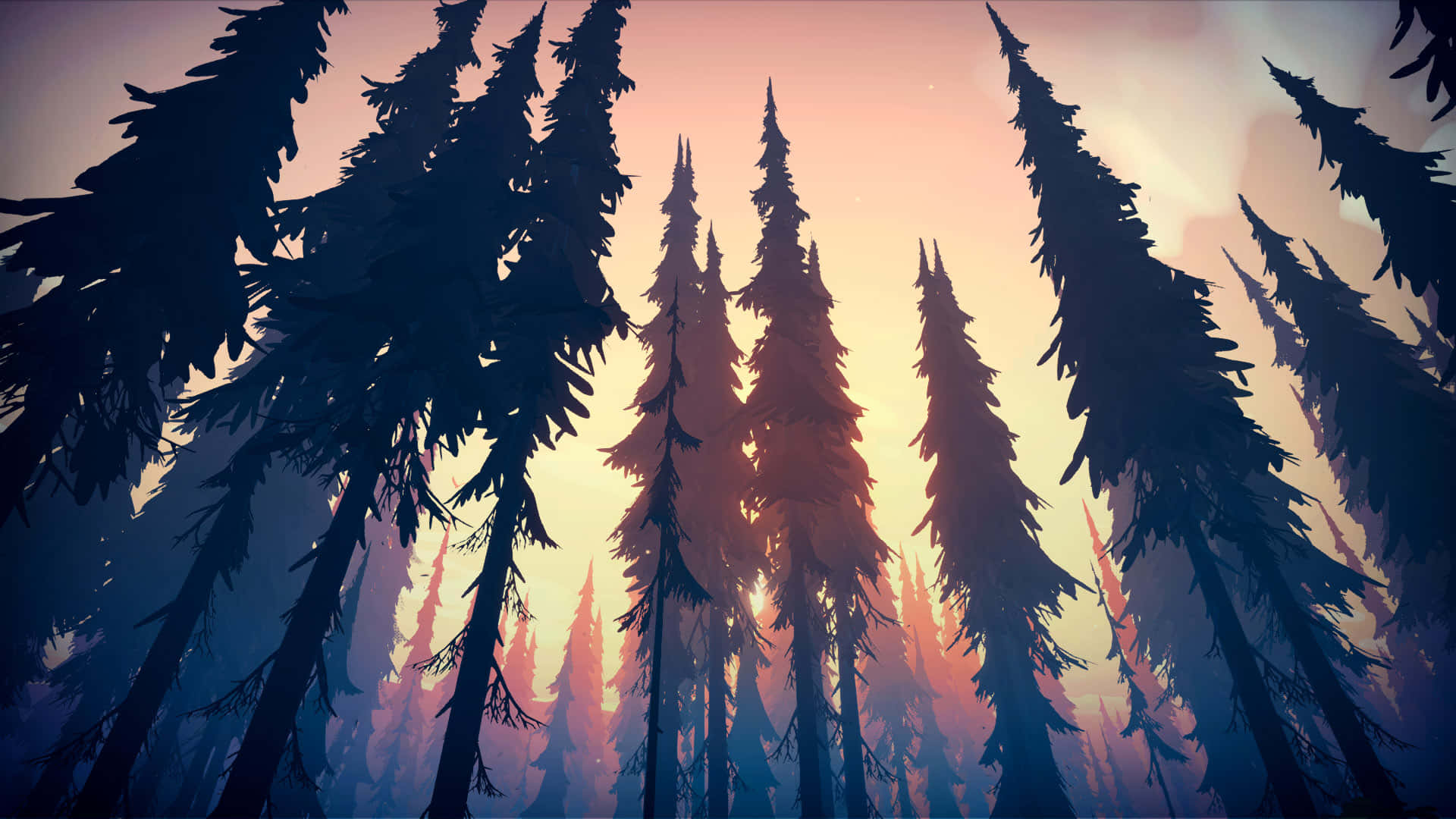 A Screenshot Of A Forest With Trees And A Sun Wallpaper -