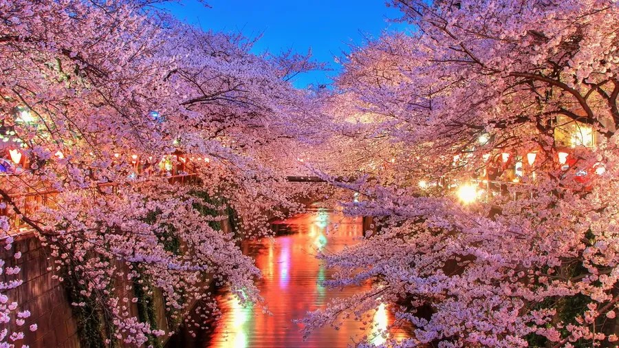 Magical Night View Of Cherry Blossom In Full Bloom Wallpaper -