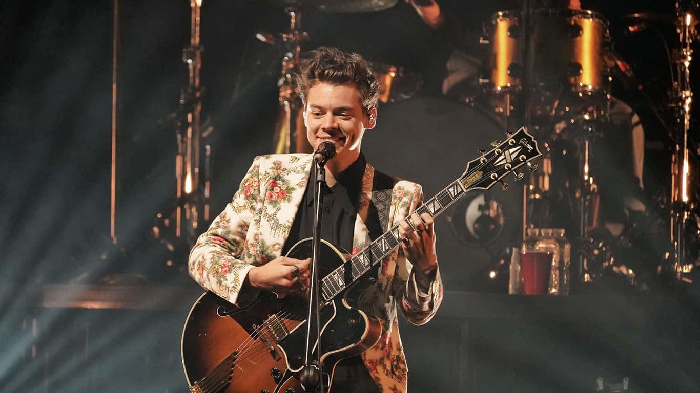 “harry Styles Working Hard At His Laptop” Wallpaper