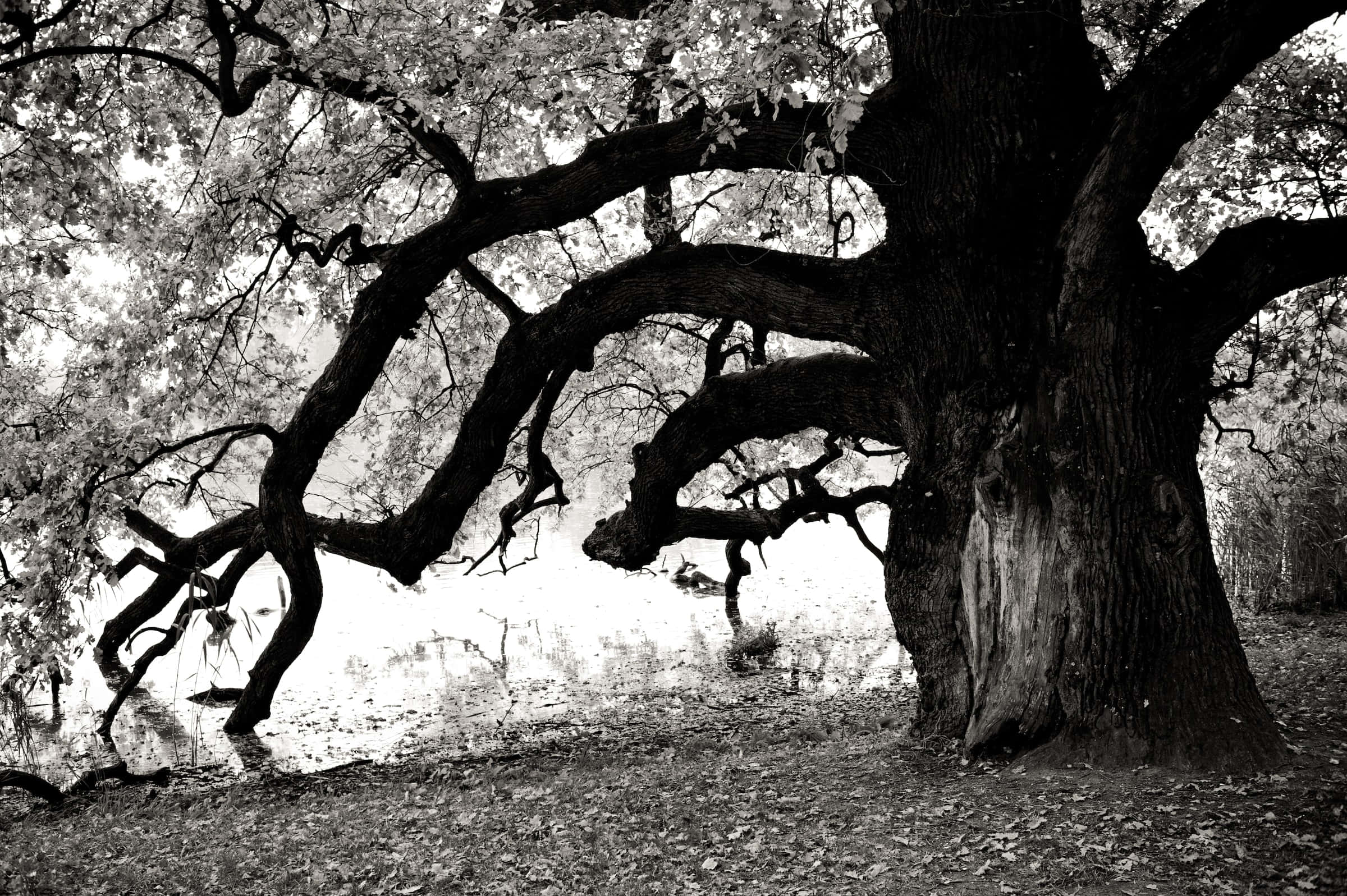 Black And White Tree In Serene Setting Wallpaper -