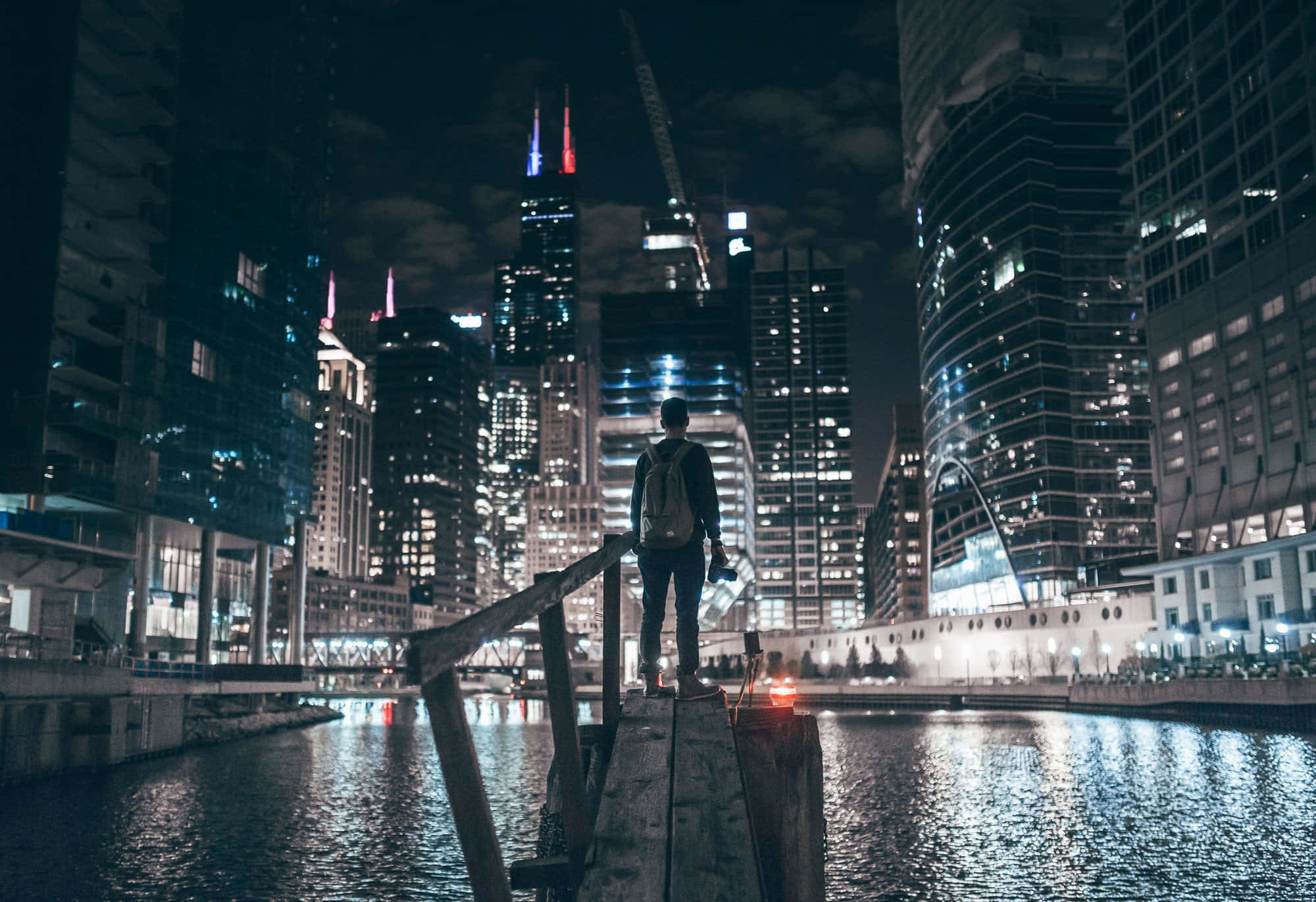 Man Standing In Chicago City Night Wallpaper -