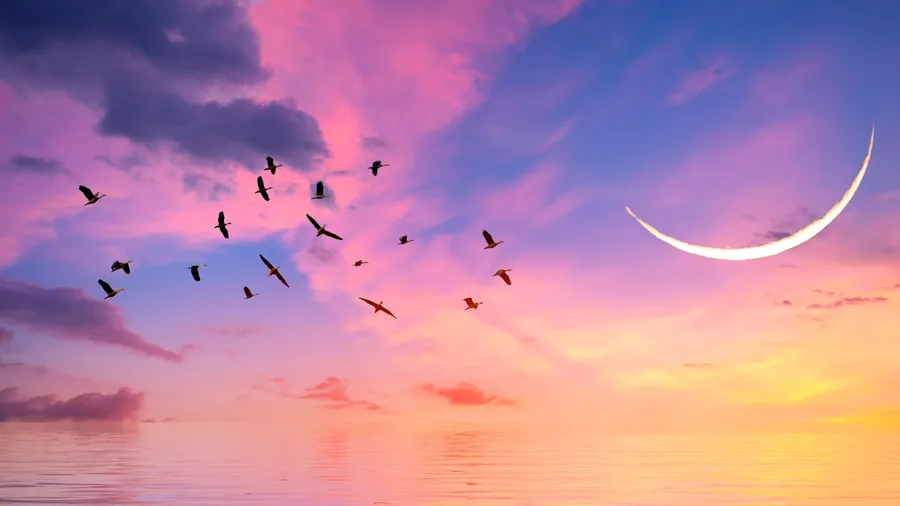 Pink Moon Cloudy Sky And Birds Wallpaper -