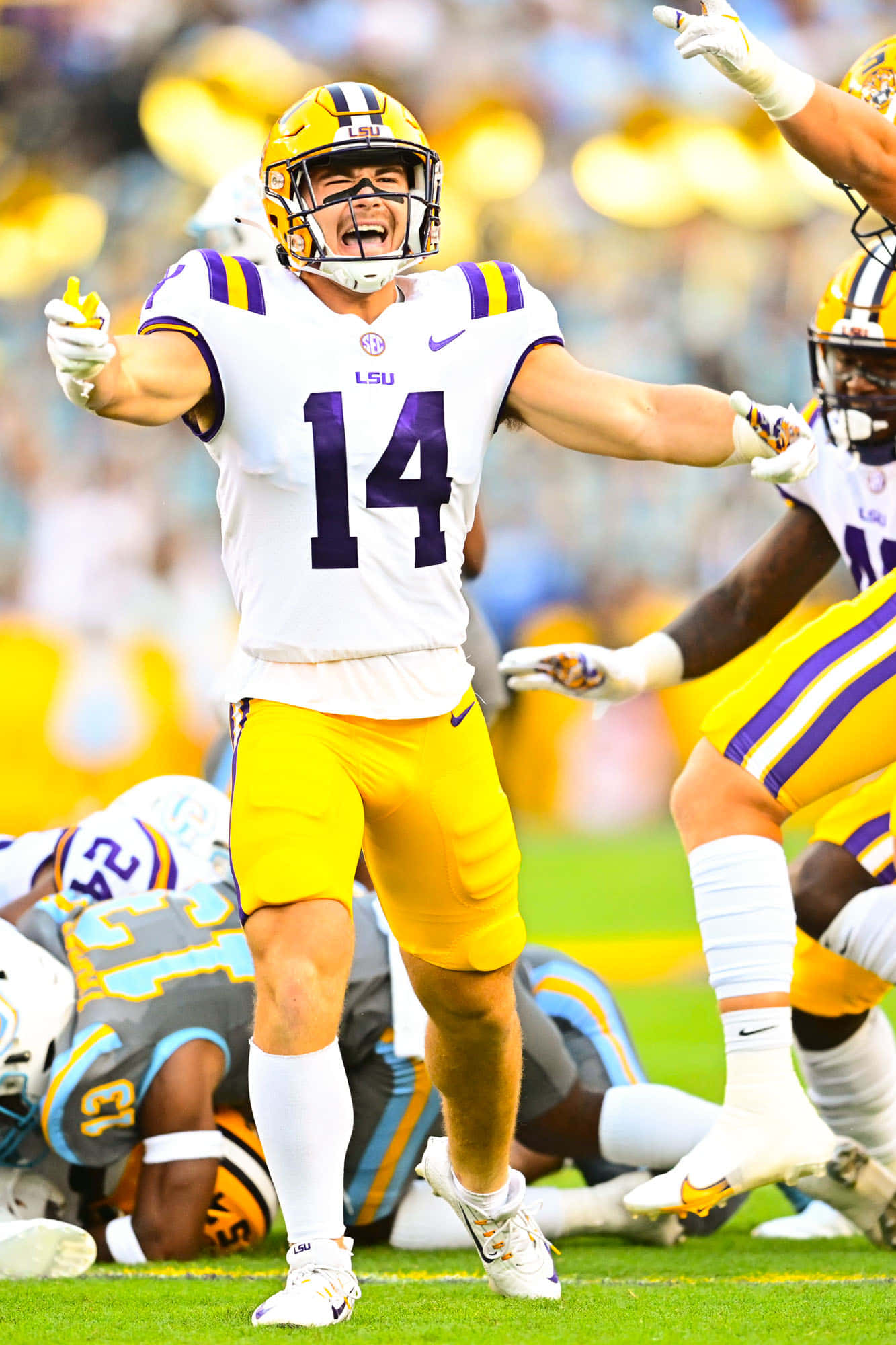 Lsu Football Players In Purple And Yellow Wallpaper -