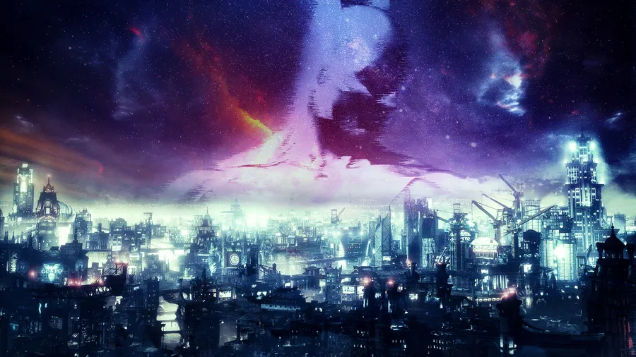A Cityscape With A Purple Sky And A City Wallpaper -
