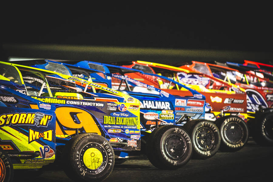 A Line Of Dirt Track Racing Cars At Night Wallpaper -