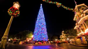 A City With A Christmas Tree And People In The Middle Wallpaper -